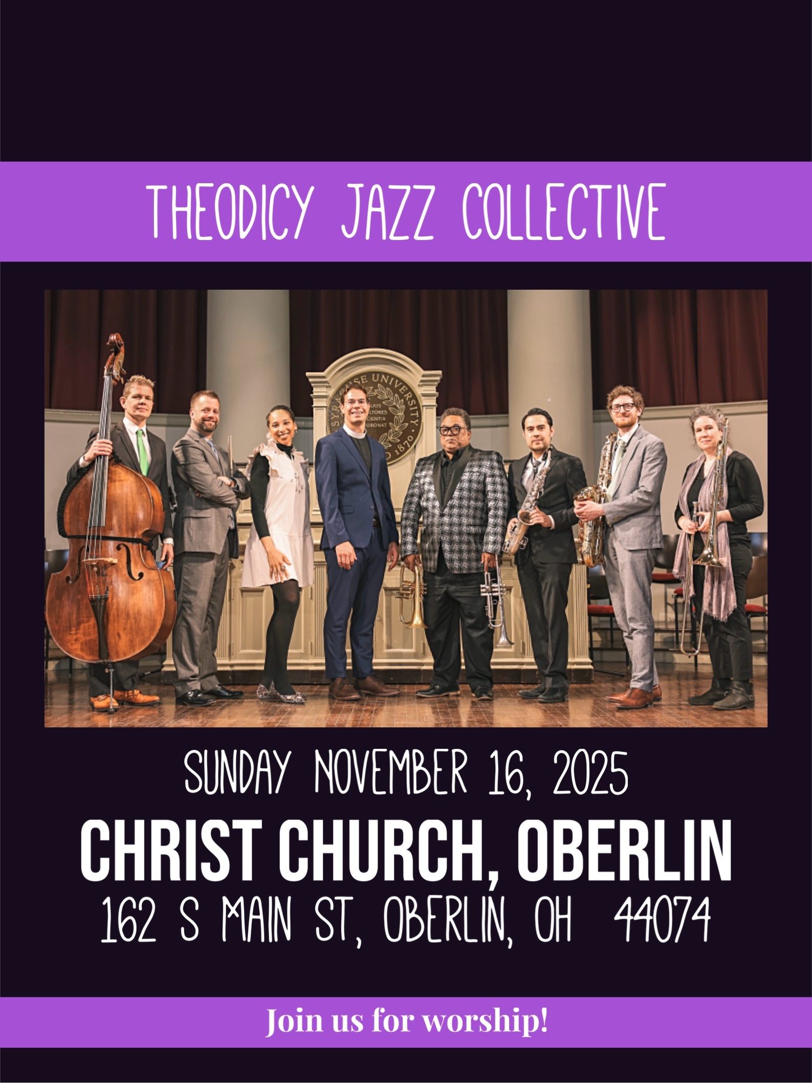 Theodicy Jazz Collective returns to its Oberlin roots to illuminate our worship at the 10:30 a.m. celebration of the Holy Eucharist on Sunday, November 16.